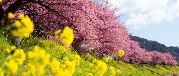 2月の時期になると下賀茂温泉を流れる青野川沿いの早咲きの桜が花開き、桜のピンク、土手には菜の花の黄色、温泉の白い湯煙と春陽気なコントラスト風景となります。