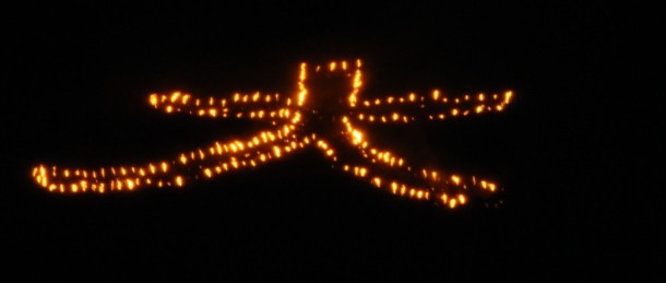 暗くなったら、広場に来ている人々の数が増えてきました。大文字焼点火が待ち遠しかったです。ちょうど点火の瞬間がやってきたら、雨が降り始めました。それでも、みんなは諦めずに、第文字焼きを見るため、辛抱強く待っていました。ついに、強羅からよく見える明星ヶ岳の中腹で大文字焼きが始まりました。イベントの価値を高めるために、大文字のそばで、素晴らしくて多彩な花火が打ち上げられました。雨が降っていても、みんなは楽しくすごい眺めに感動していました。