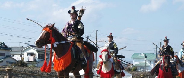 流鏑馬とは、疾走する馬上から的に鏑矢を射る、日本の伝統的な騎射の技術・稽古・儀式のことを言います。馬を疾走させる直線区間で、通常2町(約218メートル)。進行方向左手に間を置いて3つの的を立てます。馬上における弓術には、他に笠懸(かさがけ)や犬追物(いぬおうもの)があり、流鏑馬と合わせて「騎射三物」とされています。